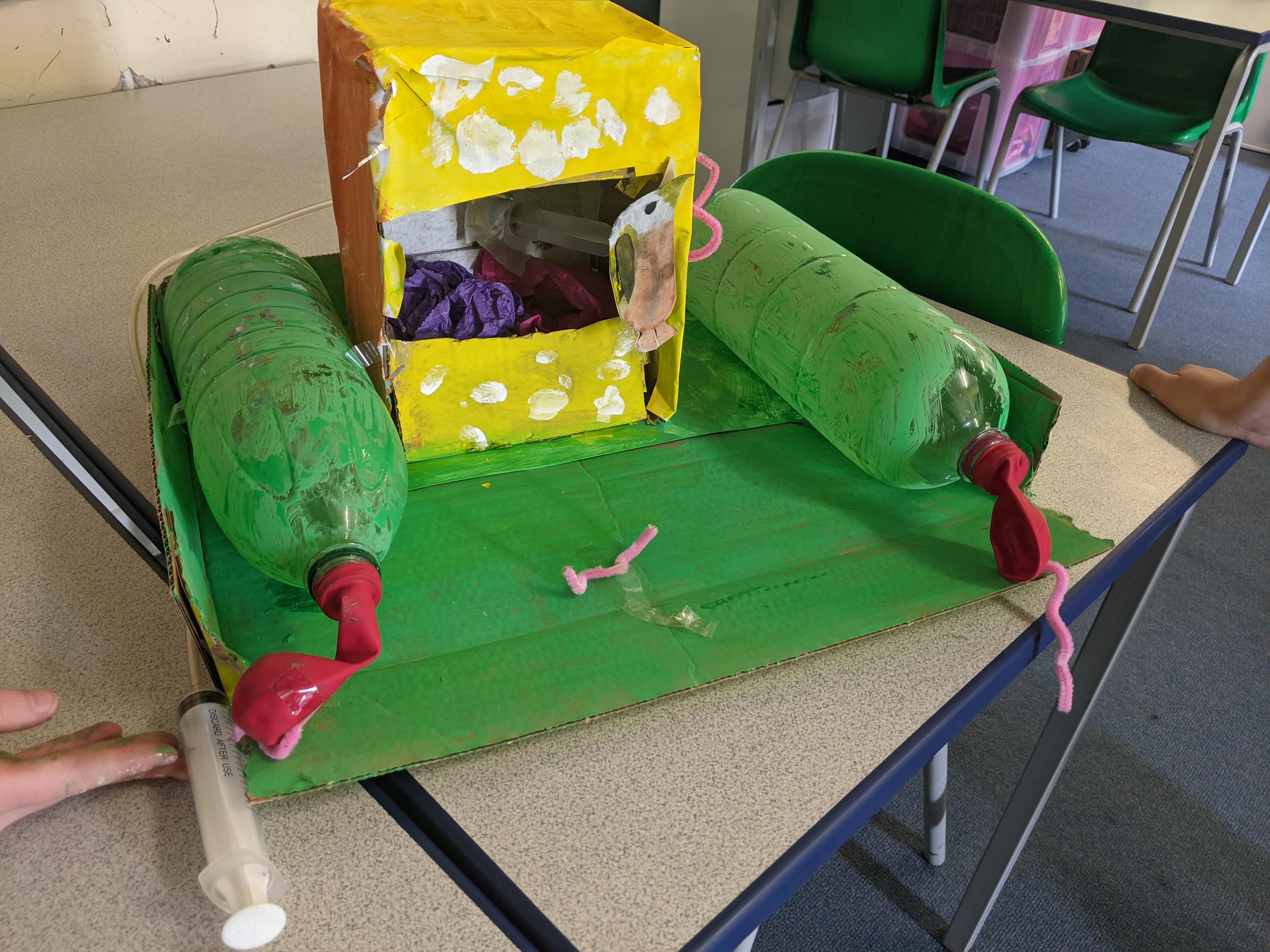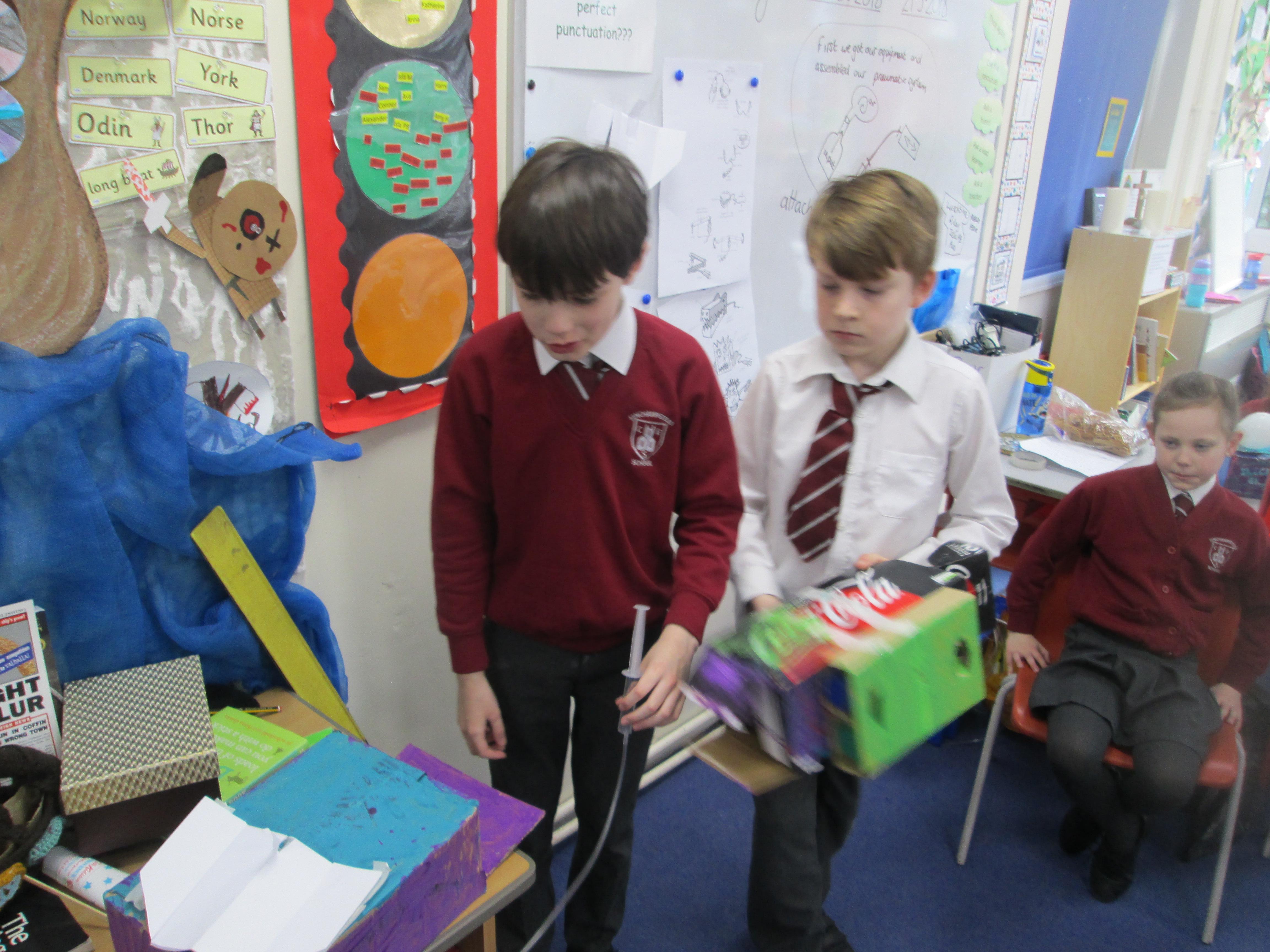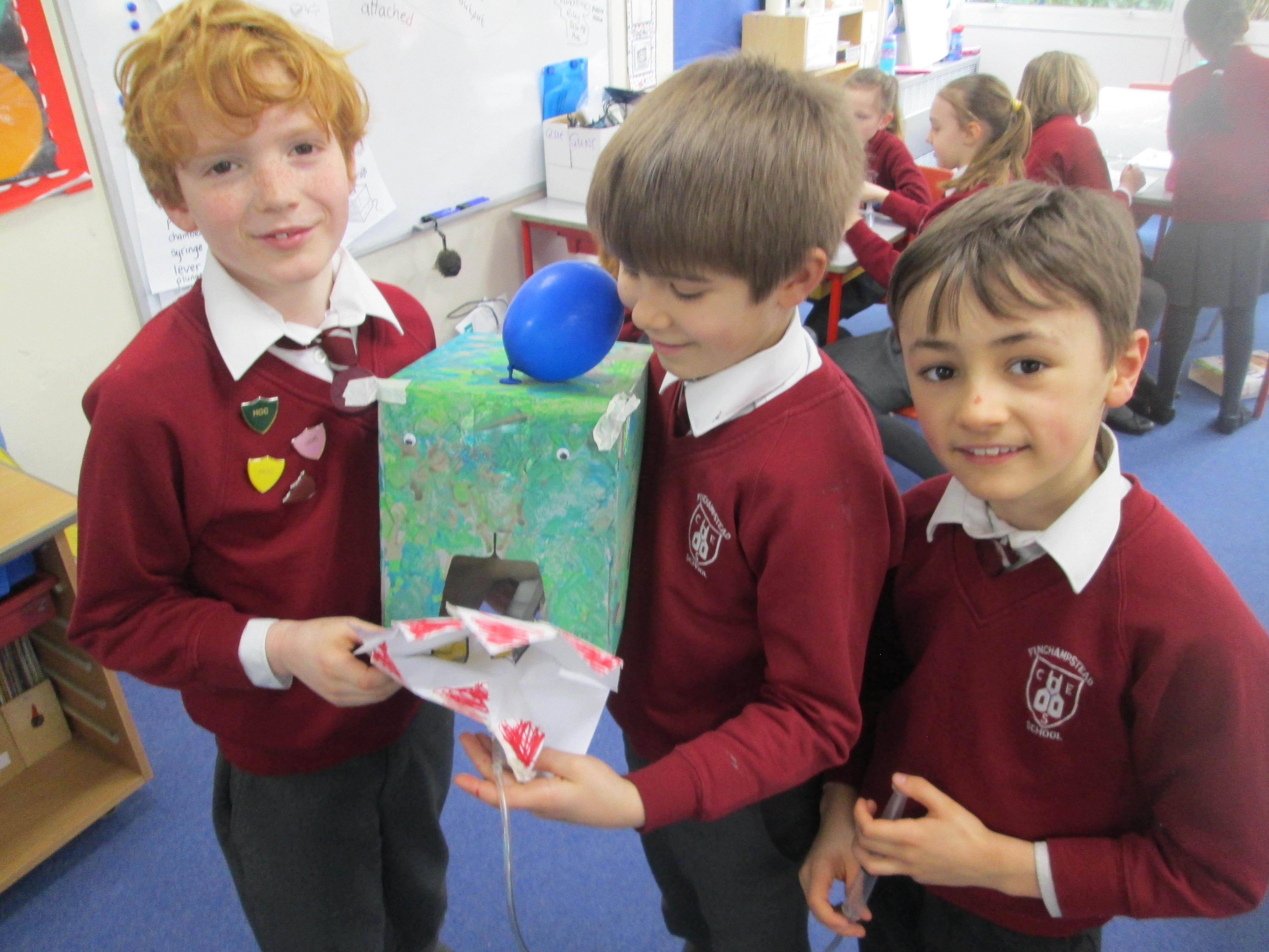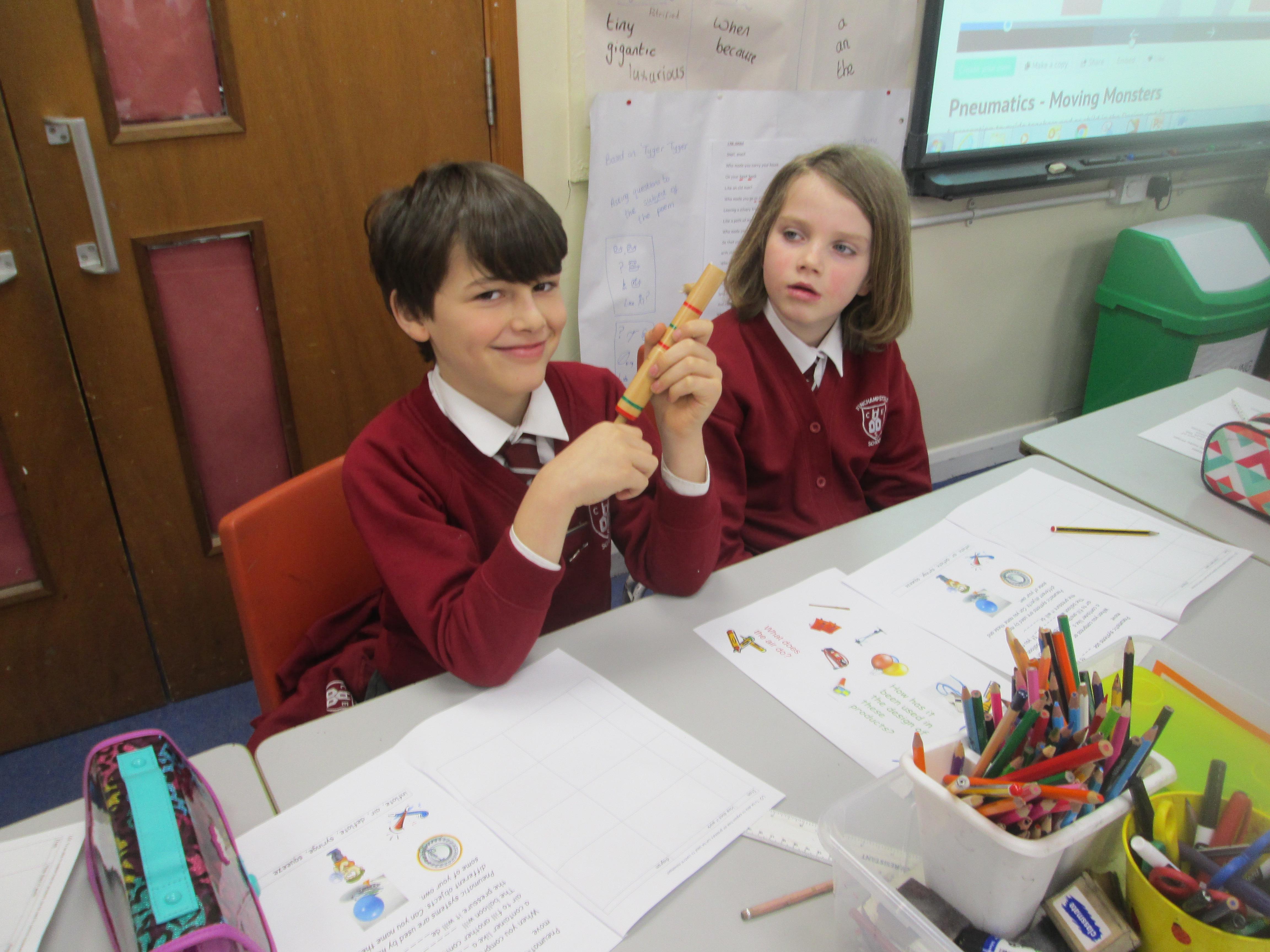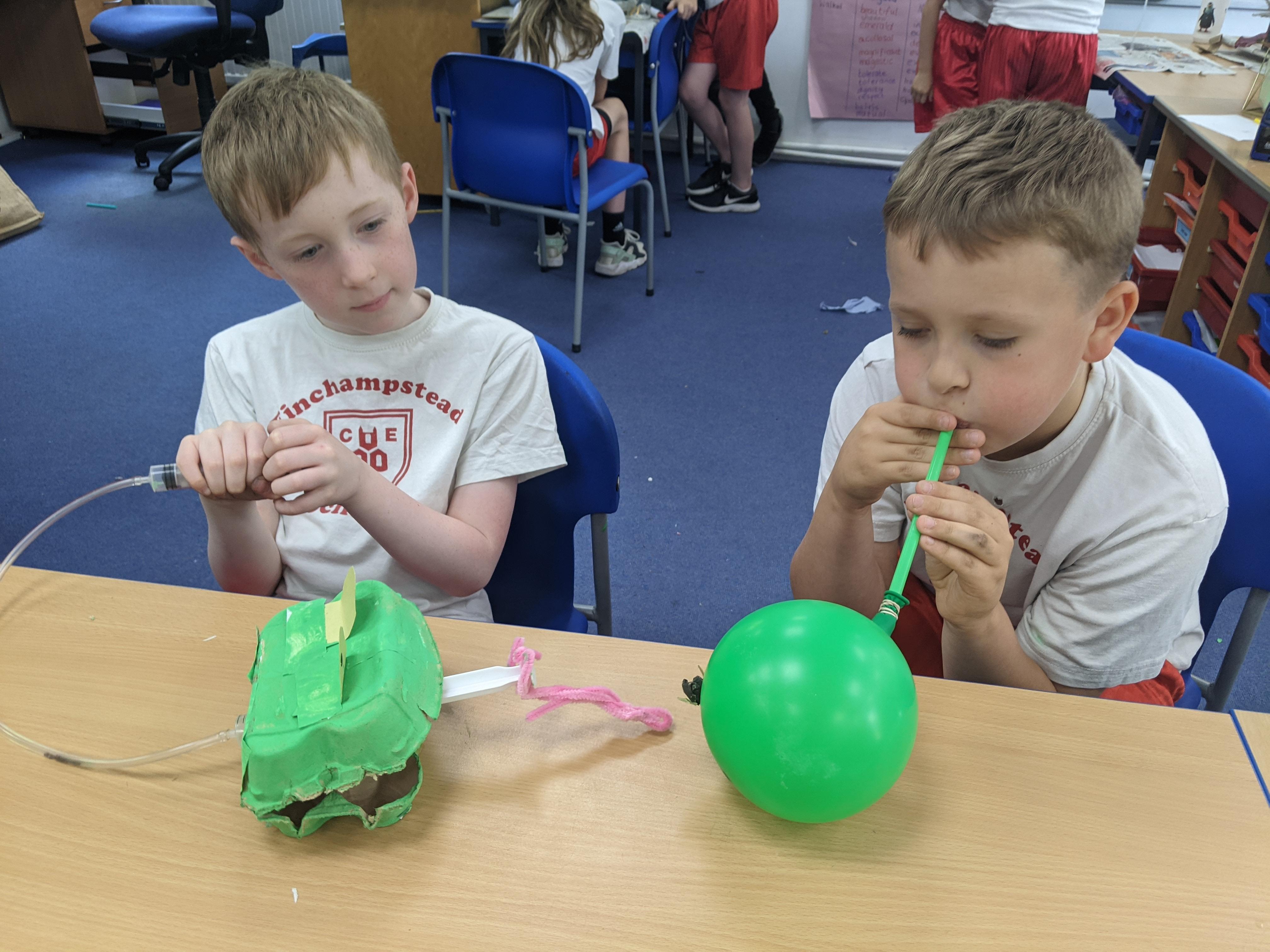 We have all seen an inflated balloon whizz off through the air, if you let go after inflating it, and before you have tied a knot in the neck.These balloons all use that principle, but take it a stage further. This is how we have explored a simple pneumatic system in DT today. Can you explain the input, the process and the output?