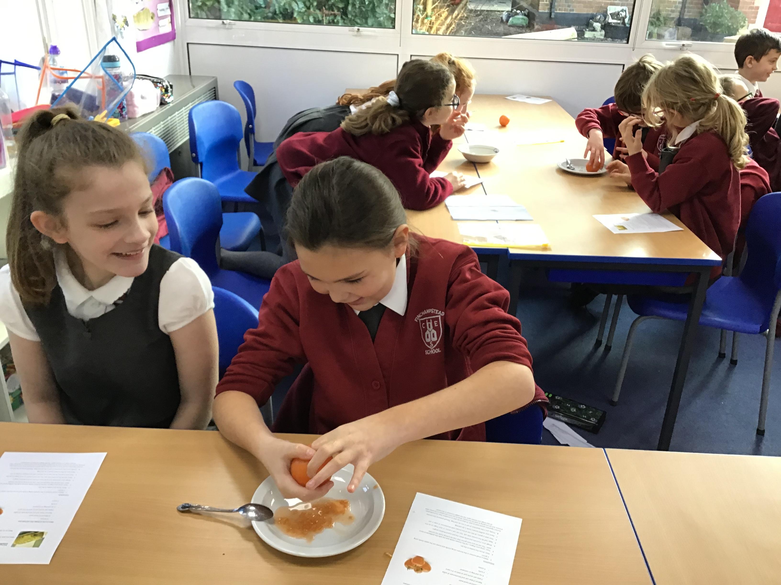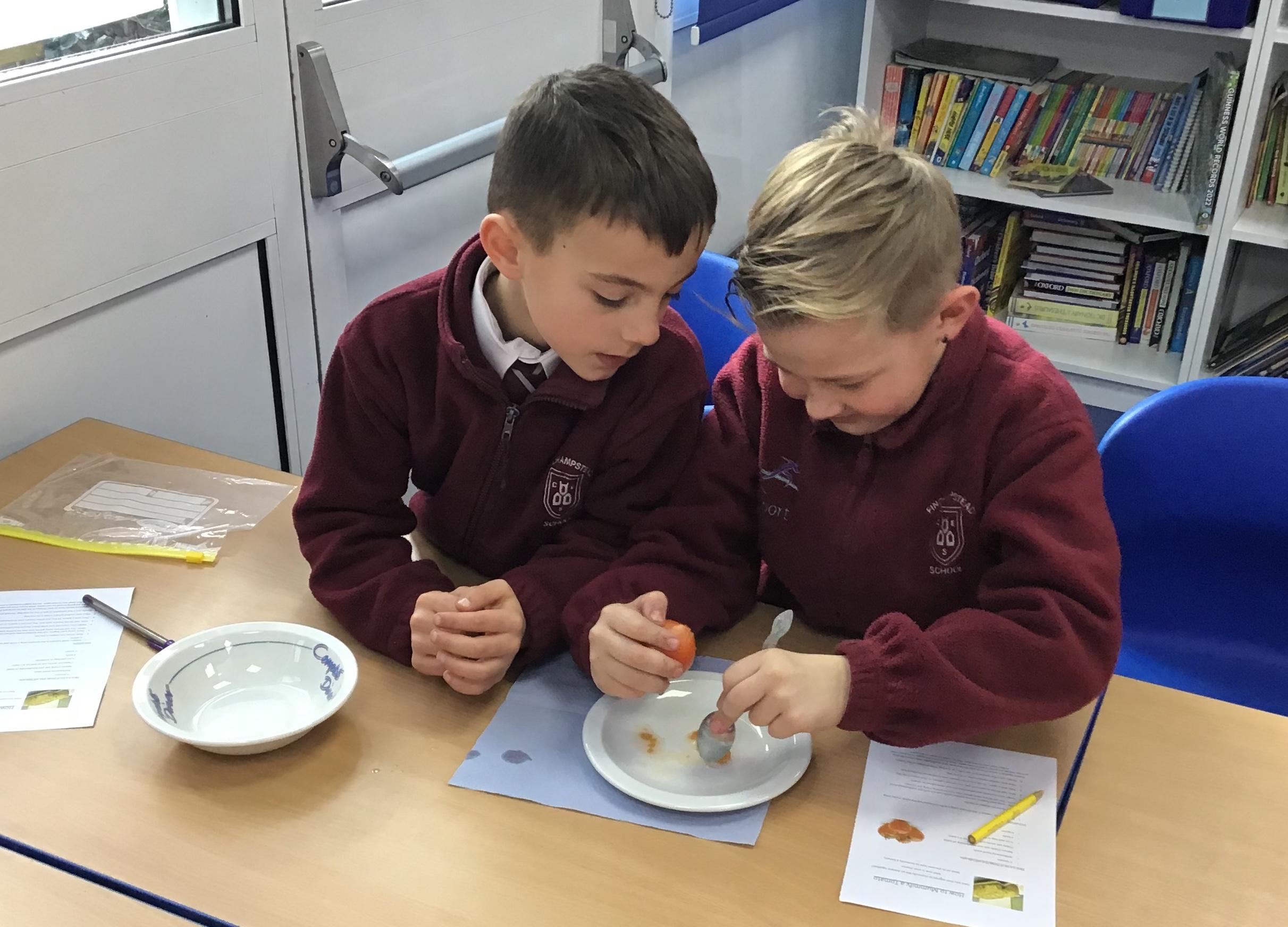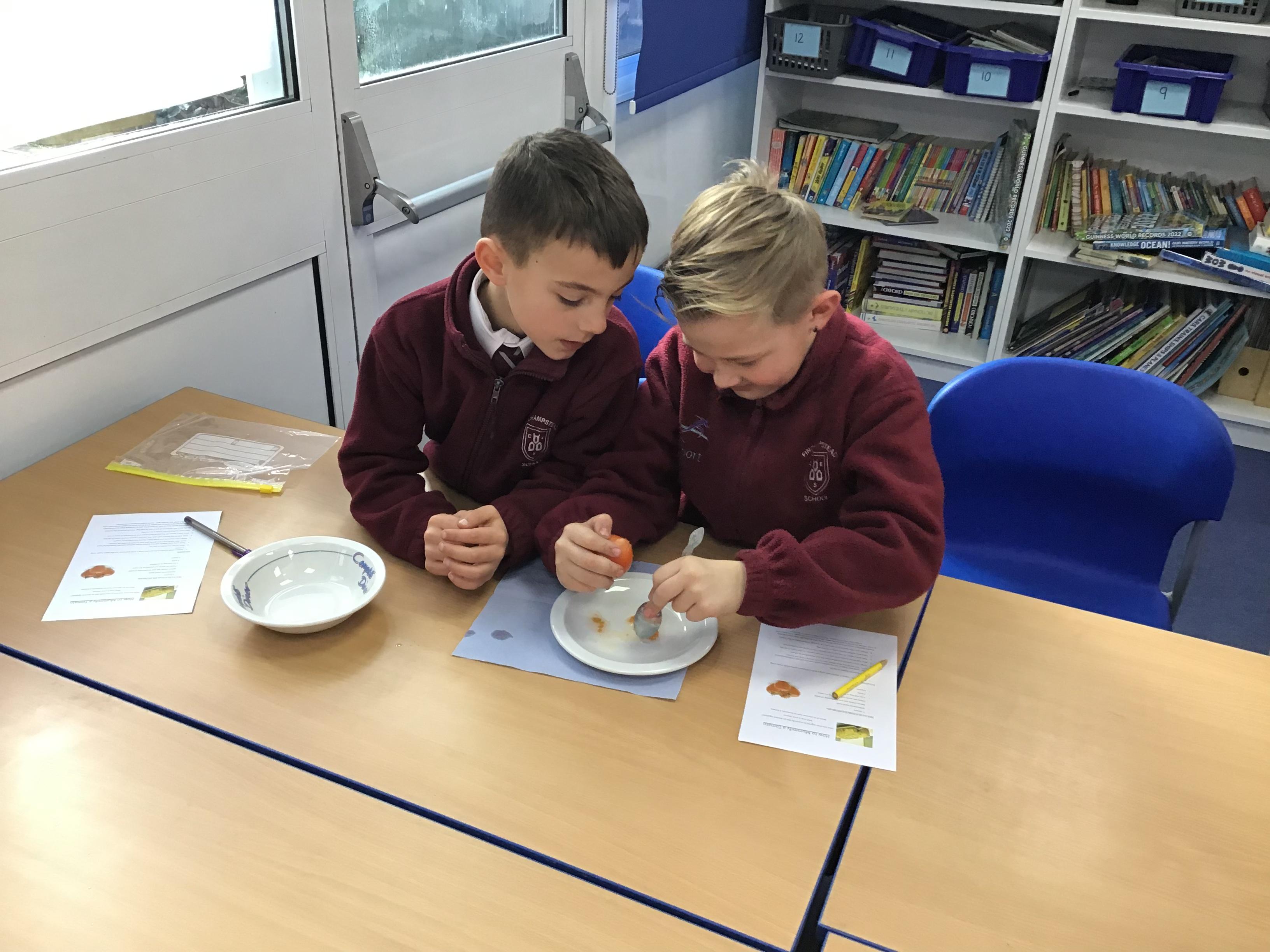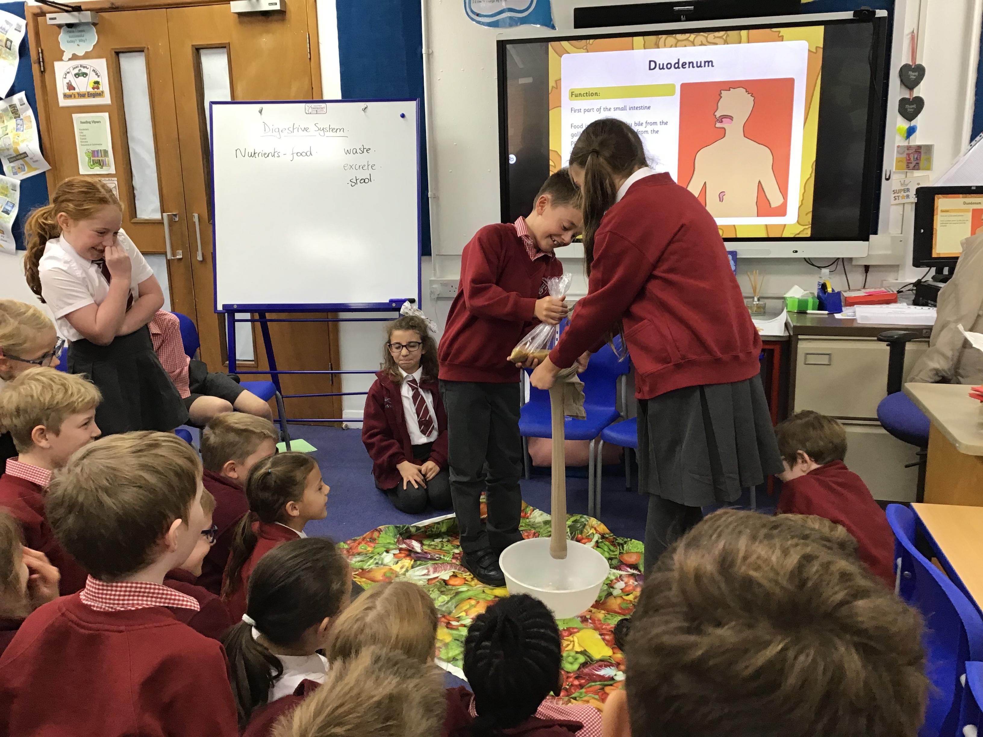 Chaffinch have been learning about the digestive system, the names of the different parts and their functions. We tried an experiment using Weetabix and orange juice to simulate how our bodies process the food we eat.
